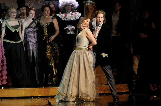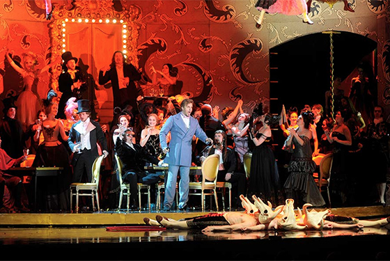 © Мариинский театр Столь невинный декор постановки, однако, тем более странен, что в предпремьерных интервью и режиссер, и художник-постановщик обещали «сделать ее правдивой, реальной», мало того — показать «живых людей из плоти и крови», которые живут ни больше ни меньше «в стиле sex, drugs and rock'n'roll». Ничего подобного на сцене Мариинского, разумеется, нет и в помине. Разве что в первой сцене пьянки гости Виолетты стыдливо удаляются парочками в дальние комнаты, другие неловко имитируют рвоту, а на балу у Флоры окна ее особняка подсвечены красным. В остальном же, включая фальшивые поцелуи и традиционно оперный кутеж в массовых сценах (хоть и тщательно прописанных), спектакль выдержан в категории 12+, как и указано на сайте театра.