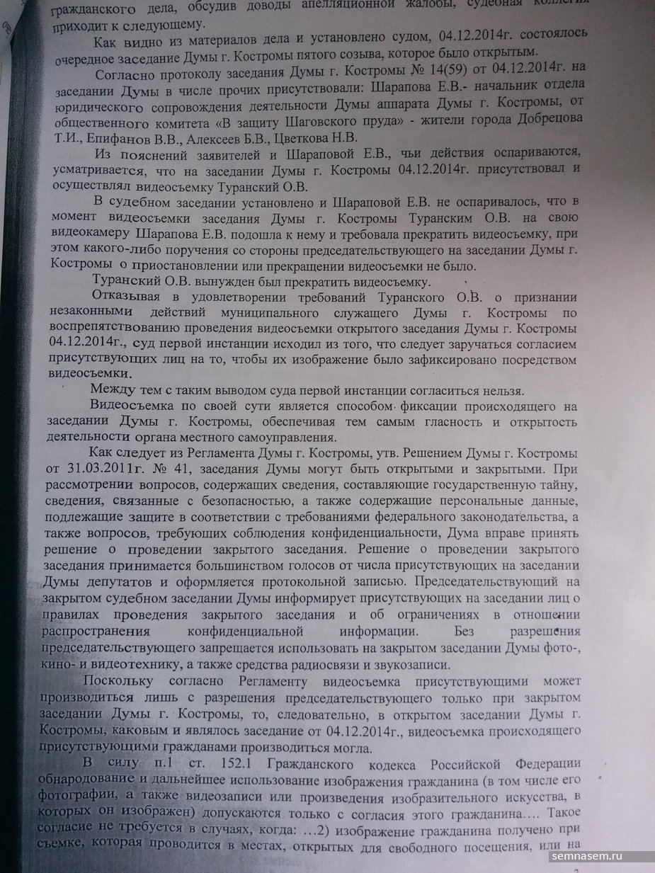 In the decision, the court stated that "the video is essentially a way to fix what is happening at a meeting of City Council of Kostroma, ensuring openness and transparency of activities of the local government". The Court added that the deputies and other people presented at the open session "agree that their image would be sealed by a photo or video, if any will be made".