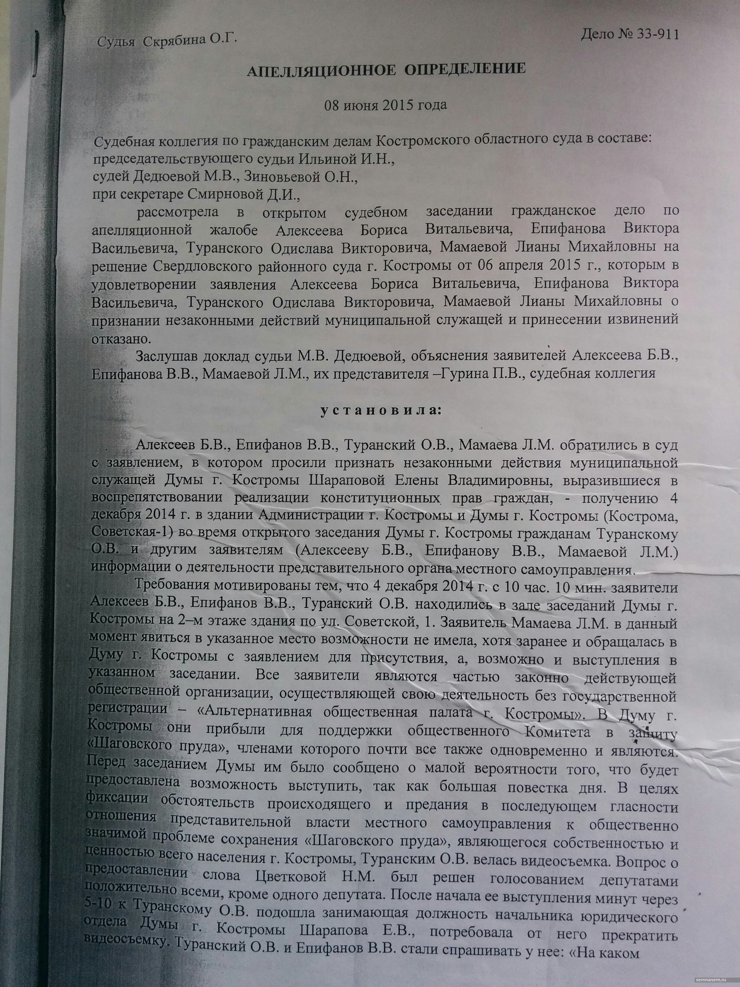 The reason for the lawsuit was the incident that occurred at a meeting of a Kostroma city council on December 4, 2014. Four civic activists — Boris Alexeyev, Victor Epifanov, Odislav Turansky and Liana Mamaeva — came to an open meeting of a city council, which among other things discussed a resonant issue of building of Shagovsky pond. At a time when a member of the Alternative Public Chamber of Kostroma Odislav Turansky was shooting speech of a civil activist Natalia Tsvetkova, the chief of the legal department of the City Duma Elena Sharapova came closer and demanded to stop shooting, saying that "it can be made only by accredited persons", and then began to press hand to the camera, lowering it down, whereby the operator had to stop filming.