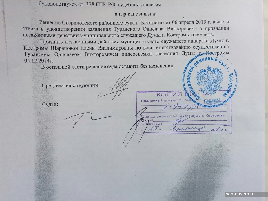 After that, representatives of the Alternative Public Chamber of Kostroma went to court, demanding to recognize the official's actions illegal. But the judge of Sverdlovsk district court Olga Scryabina denied the plaintiffs claims. After that, the applicants appealed against the decision in the Kostroma Regional Court, which overturned the decision of the Court of First Instance found the actions of municipal employee Sharapova for obstruction of video illegal.