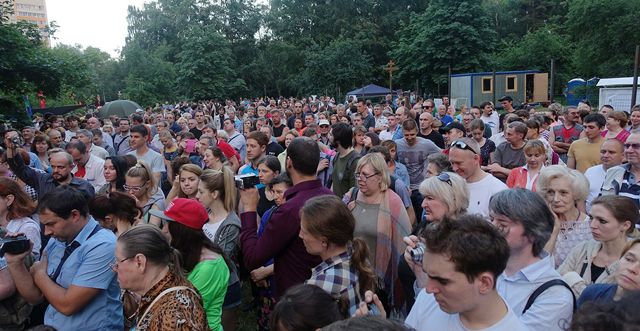 Через час начался запланированный ранее митинг. Выступали депутаты разного уровня, преимущественно из КПРФ. Илья Ахромеев, человек в военной форме и всеобщий любимец, не выпускал гармонь из рук и собрал целый хор местных бабушек. «Не зная брода, не суйся в воду!» — злорадно пели они в десять голосов, явно обращаясь к защитникам храма. Народу было уже явно более тысячи человек. Полиция зачем-то проводила хаотические задержания, хотя акция была законной. В автозаки отправились и группа левых активистов, защищавших когда-то Химкинский лес, и Катанаев и люди из «Яблока». Всего, по данным «ОВД-Инфо», больше двадцати человек.