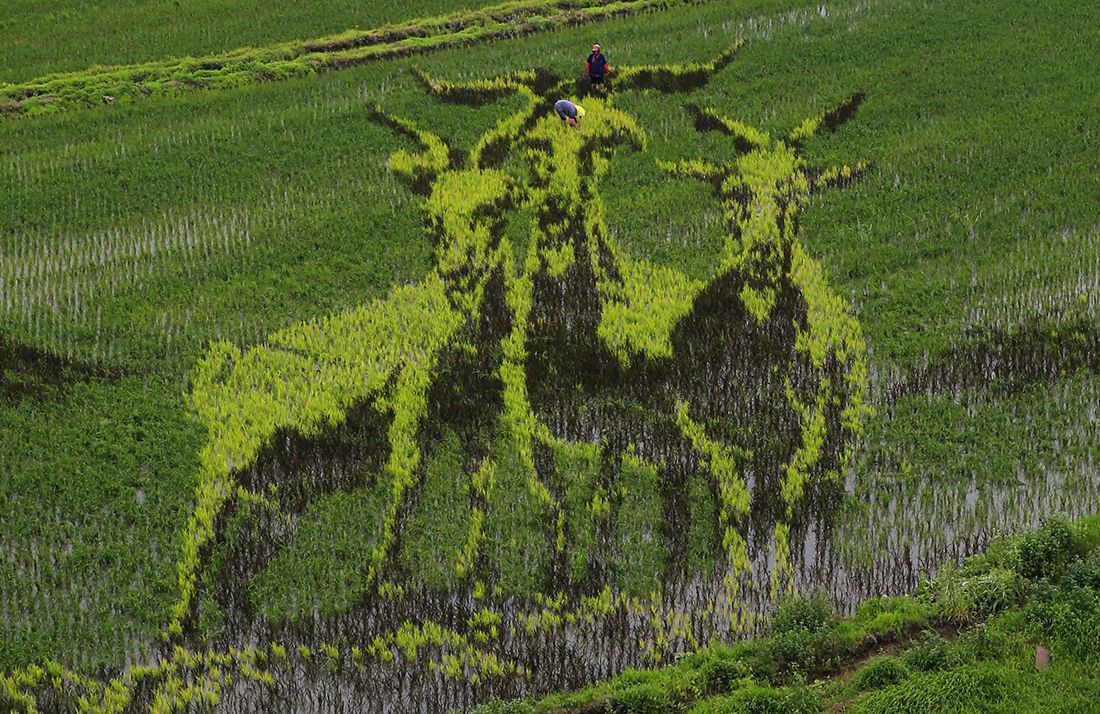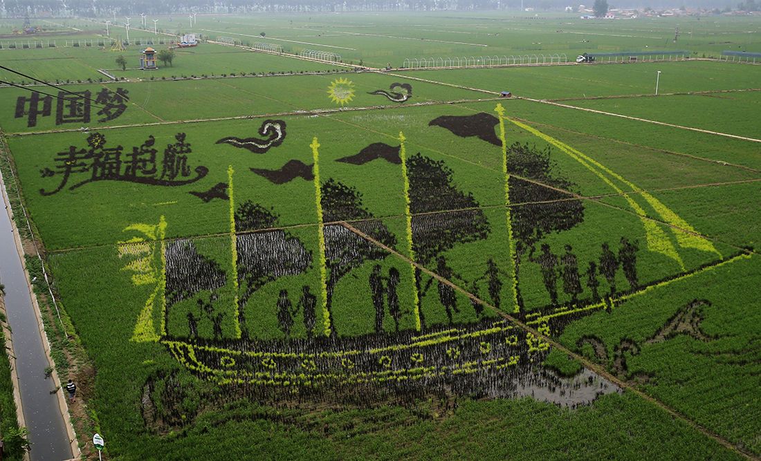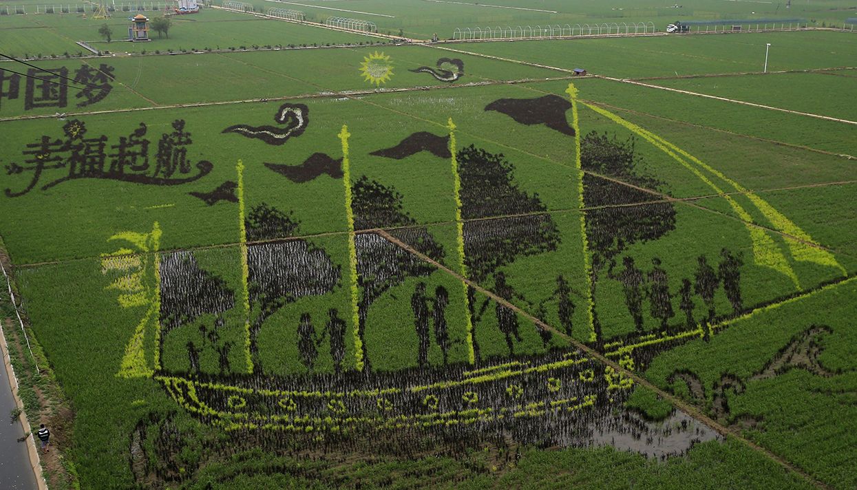 В китайском городе Шэньян из рисового поля сделали гигантское полотно площадью 10 гектар и изобразили на нем 13 картин. Для создания изображений, рассказывает «Жэньминь жибао», официальная газета ЦК Коммунистической партии Китая, применялись «передовые 3D-технологии и просвечивающие технологии» (неясно, о чем речь), а разные сорта риса окрашивали разными цветами.