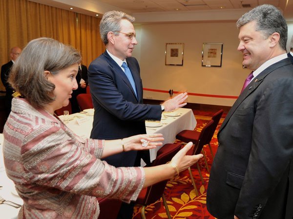 Виктория Нуланд и Петр Порошенко Фото: United States Government Резолюция ПАСЕ, В.Путин звонит Б.Обаме, генерал Бридлав напоминает об открытой границе, Госдепартамент США доделал ежегодный доклад о состоянии прав человека в мире, а П.Порошенко подписал Закон о миротворцах. И все это — об Украине с Россией.