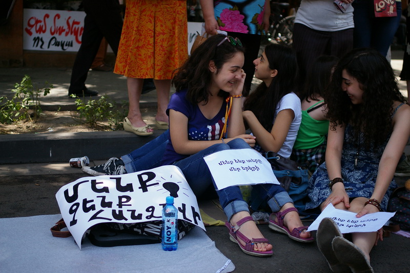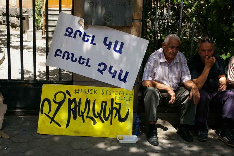 Действительно, антироссийских лозунгов или разговоров здесь не слышно, хотя, по словам Чамоняна, некоторые из наиболее радикальных участников протеста вряд ли будут говорить о российских властях в положительном ключе. "Мы просто хотим, чтобы нас уважало наше правительство, чтобы они вспомнили, что они наши наемные работники и у них есть обязанности, которые они должны выполнять в соответствии с конституцией. Мы один народ, мы не противопоставляем себя друг другу. Мы не хотим всех этих "геть!", "на гиляку" и так далее, нас, армян, и так мало. Мы не хотим бить друг друга. В 2008-м уже побили, нам хватило. Это стало для Армении холодным душем (5 лет назад, в феврале 2008 года при разгоне протестов несогласных с итогами президентских выборов в Ереване погибли по меньшей мере 8 человек, более 250 были ранены. – Прим. РС)".