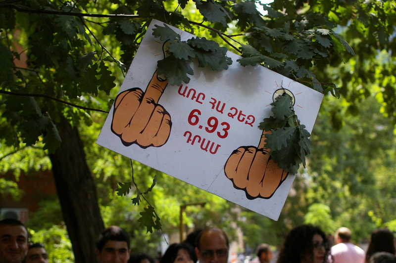 Даже если не брать в расчет очевидные внешние сходства, присущие подобным акциям протеста, можно долго спорить с участниками акции в Ереване о том, сравним ли их протест с Майданом – сами они считают своим долгом первым делом заявить любому журналисту, что это не так, что они не хотят революций, многие здесь действительно поддерживают политику России по отношению к Украине и искренне верят в то, что по украинским городам ходят факельные шествия фашистов. Российское телевидение тоже смотрят многие, в чем сами с готовностью признаются. Однако сомневаться в том, что спусковым крючком протеста действительно стало незначительное по российским меркам подорожание электроэнергии, перестаешь уже после нескольких бесед с простыми людьми на проспекте Баграмяна. Средний счет за электричество в переводе на рубли – от 2 до 4 тысяч в месяц, зимой еще больше, поскольку центральное отопление в большинстве домов отсутствует. Это при том, что даже в Ереване зарплата редко превышает 200-300 долларов. Газ, который, как и электричество, продает в Армении "дочка" российского монополиста, "Газпрома", здесь также один из самых дорогих в СНГ. Не только для пенсионеров, даже для работающих семей подорожание киловатта электроэнергии на 6,93 драма (80 копеек) – реально вопрос выживания. Особенно в условиях значительной (почти на 20%) девальвации национальной валюты из-за кризиса в России, стране, с которой у Армении самые тесные экономические связи.