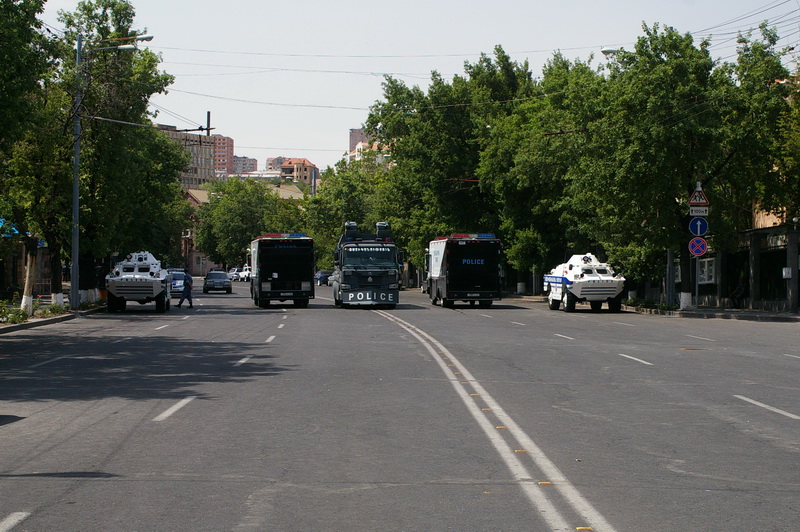 Еще перед нашим вылетом из Москвы в социальных сетях стали появляться сообщения о том, что обстановка в центре Еревана накаляется, полиция усилила свое присутствие, спецтехника, в том числе разгонявший людей 23 июня водомет, приведена в боевую готовность. Позже выяснилось, что причиной напряжения стала акция протеста автомобилистов, которые также в знак протеста против повышения цен на электричество заблокировали один из основных перекрестков рядом с проспектом, встав в круг и включив дальний свет фар. Этот своеобразный "автомайдан" (именно такое сравнение приходит в голову, как бы ни расстраивались от сравнения с Майданом активисты в Армении) не был согласован с организаторами демонстрации на Баграмяна, поэтому полиция восприняла его как провокацию. Впрочем ситуацию довольно быстро удалось разрешить и машины разъехались. Вообще, говорить об "организаторах" и "координаторах" протестов в Ереване можно с большой долей условности: к числу первых себя относит десяток общественных активистов, и координировать свои действия у них порой получается с трудом.