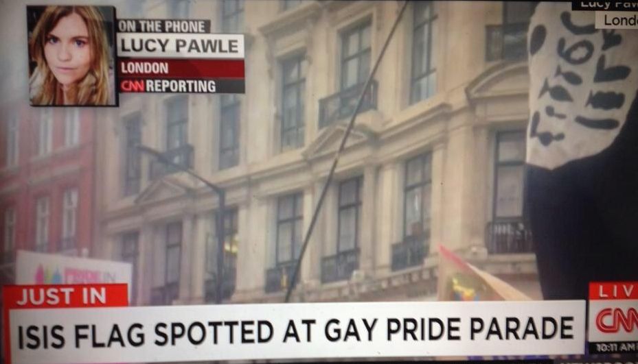 Телеканал CNN рассказал о том, что на гей-параде в Лондоне в субботу пронесли флаг «Исламского государства». Титр именно в таком виде — «Флаг ИГИЛ заметили на гей-параде» — демонстрировался на экране в новостном сюжете.
