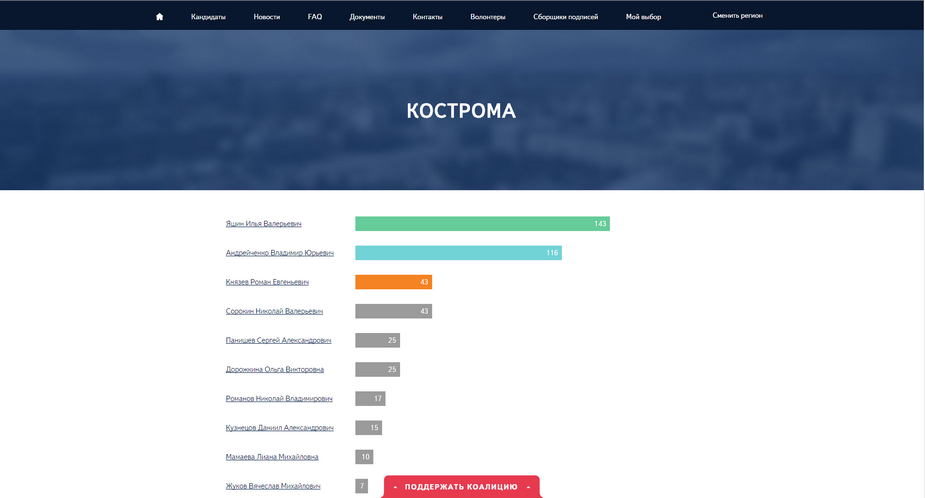 «Яшин, Андрейченко, Сорокин/Князев — объективно честный результат, отражающий ситуацию. Кострома решила», — написал в «Твиттере» представитель штаба Демкоалиции Андрей Пивоваров.