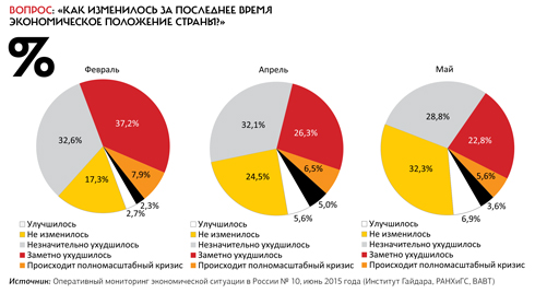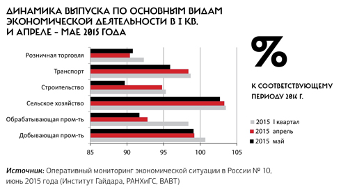 Короче, власть ломает голову, как ей пройти те два года, которые президент объявил «трудными» и после которых экономика, как надеются, снова начнет расти. По данным июньского прогноза Института Гайдара, падение ВВП в 2015 году составит 2,8 % — это в базовом сценарии. В пессимистическом (цены на российскую нефть Urals будут держаться в районе $55–60 за баррель) — 4,2 %, а в 2016-м — еще на 2,9 %. Реальные доходы населения за два года (2015–2016) снизятся на 6 %, инфляция в этом году составит 12 %. Но главный вопрос, конечно же, в том, что Путин покажет простым избирателям в 2018 году: падение доходов или все-таки их рост.