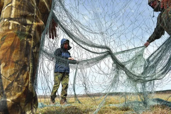 Разумеется, простым наблюдением и подсчетом дело не ограничивается — по полю для прикорма рассыпается овес, для наблюдений и съемок устраиваются скрадки, есть даже деревянная наблюдательная вышка. Особая гордость орнитологов РГГ — тщательно замаскированная от гусей и людей ловушка уникальной конструкции, которая позволяет (если, конечно, гуси на нее заходят) моментально и без травм отловить птиц для кольцевания и взятия проб. Подобным устройством голландские фермеры для отлова гусей на зимовках пользуются еще с конца XIX века. В наши дни, впрочем, пойманных в польдерах гусей не едят, а кольцуют с научными целями.