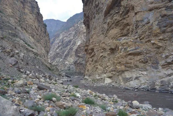 Со стороны водителей мы встретили полное понимание и стартовали ранним утром следующего дня, 11 июня. За 14 часов с несколькими короткими остановками покрыли маршрут предыдущих пяти дней (335 км) и вновь оказались в окрестностях Рампура. Из прохладной Казы (+17 ºС), «потеряв» полтора градуса широты и почти 3000 м высоты, очутились в долине среднего течения Сатледжа (+35 ºС). Узкая, извилистая дорога вдоль Сатледжа была достаточно тяжелой из-за большого числа опасных осыпей и частых камнепадов. В нескольких местах на обочинах дороги стояли смятые глыбами дорожные машины. На одну из наших машин также упало несколько камней, правда мелких, не причинивших вреда.