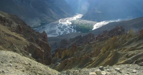 Двигаясь далее вдоль ущелий Сатледжа и его правобережного притока Спити, к 10 июня мы достигли высокогорного селения Каза (Kaza, или Kaja, 3600 м над уровнем моря). Оно расположено в верхней части долины Спити (Spiti Valley). Отсюда мы намеревались, преодолев перевал Кунзум (Kunzum Pass, 4551 м), попасть в город Кейлонг и далее по национальному шоссе № 1 (Манали — Лех) в Ладак. Но именно в Казе начались наши неожиданные «приключения», заставившие круто изменить дальнейший ход экспедиции.