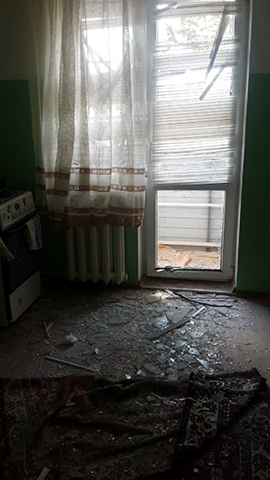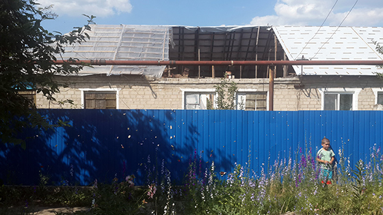 © Юрий Марченко Следы «Града» в жилом доме Удивительно красивая пожилая пара стоит у своего недостроенного дома и рассказывает, что снаряды и мины к ним прилетали трижды. Дом теперь не только недостроенный, но и полуразрушенный. Что с ним делать дальше — они не понимают. На прощание старушка выносит нам свежие огурцы: «Возьмите, вкусные».