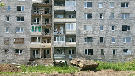 Где-то рядом работает артиллерия. На глаза то и дело попадаются разрушенные дома. Мы останавливаемся у одного из них и сигналим. Из только что казавшихся вымершими строений неожиданно появляются люди: по официальным данным, из почти 10 000 населения в городе остался каждый пятый. Если до этого мы приезжали к отдельным людям и вручали продукты и припасы адресно, то сейчас все наоборот.