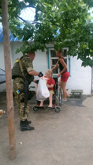 Мы едем в небольшое село у линии фронта — Бердянское. Вообще-то мы собирались в соседнее Широкино, но военные предупреждают, что там идут массированные обстрелы, работают снайперы, а несколько оставшихся местных не выходят из подвалов и пробраться к ним невозможно. Бердянское тоже постоянно обстреливается, поэтому нам выделяют сопровождение из новой структуры CIMIC — Civil-military co-operation. По замыслу Минобороны, «симики» призваны помогать волонтерам и обеспечивать хотя бы относительную их защиту.