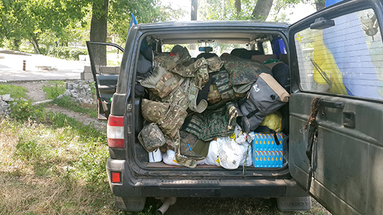 Я еду в автомобиле Жени Подвального — инженера-геодезиста, который с первых дней конфликта взялся возить на своем «УАЗ Патриот» все необходимое для солдат и мирных жителей. К его гигантскому внедорожнику приделан огромный украинский флаг, задние окна завешены стягами Воздушно-десантных войск с автографами видных десантников. Из магнитолы несется «Расплескалась синева, расплескалась».