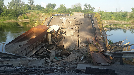 Напоследок «Айдар» завозит нас к себе на передовую. Взорванный мост через Северский Донец. Я стою на одном берегу, а на другом, метрах в двадцати, — уже Луганская народная республика. Земля усыпана гильзами. Бойцы из ближайшего опорного пункта развлекаются как могут: к деревянной веранде в лесу прибита табличка: «Кафе “Передок”». Кабинка туалета накрыта огромным плакатом с надписью «В центре Москвы». Мы грузимся в свой «Патриот». Один из бойцов советует: «Как выедете на дорогу, сразу газуйте — тут все пристреляно, может “прилететь”».