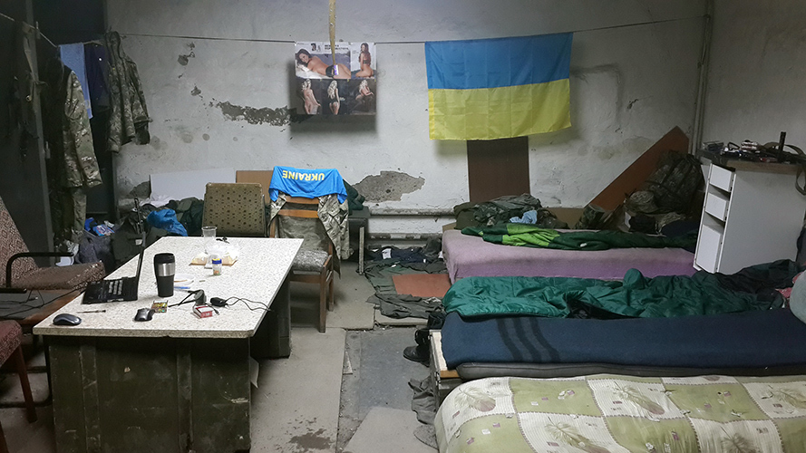 На базу 95-й бригады приезжаем глубокой ночью. В полутьме грозно вырисовываются силуэты БТР. Бойцы практически вслепую играют в баскетбол с самодельным кольцом. Позиции здесь совсем рядом, так что канонада звучит беспрерывно. Мы спускаемся в подвал, где оборудованы и кухня, и спальня, и пункт связи.
