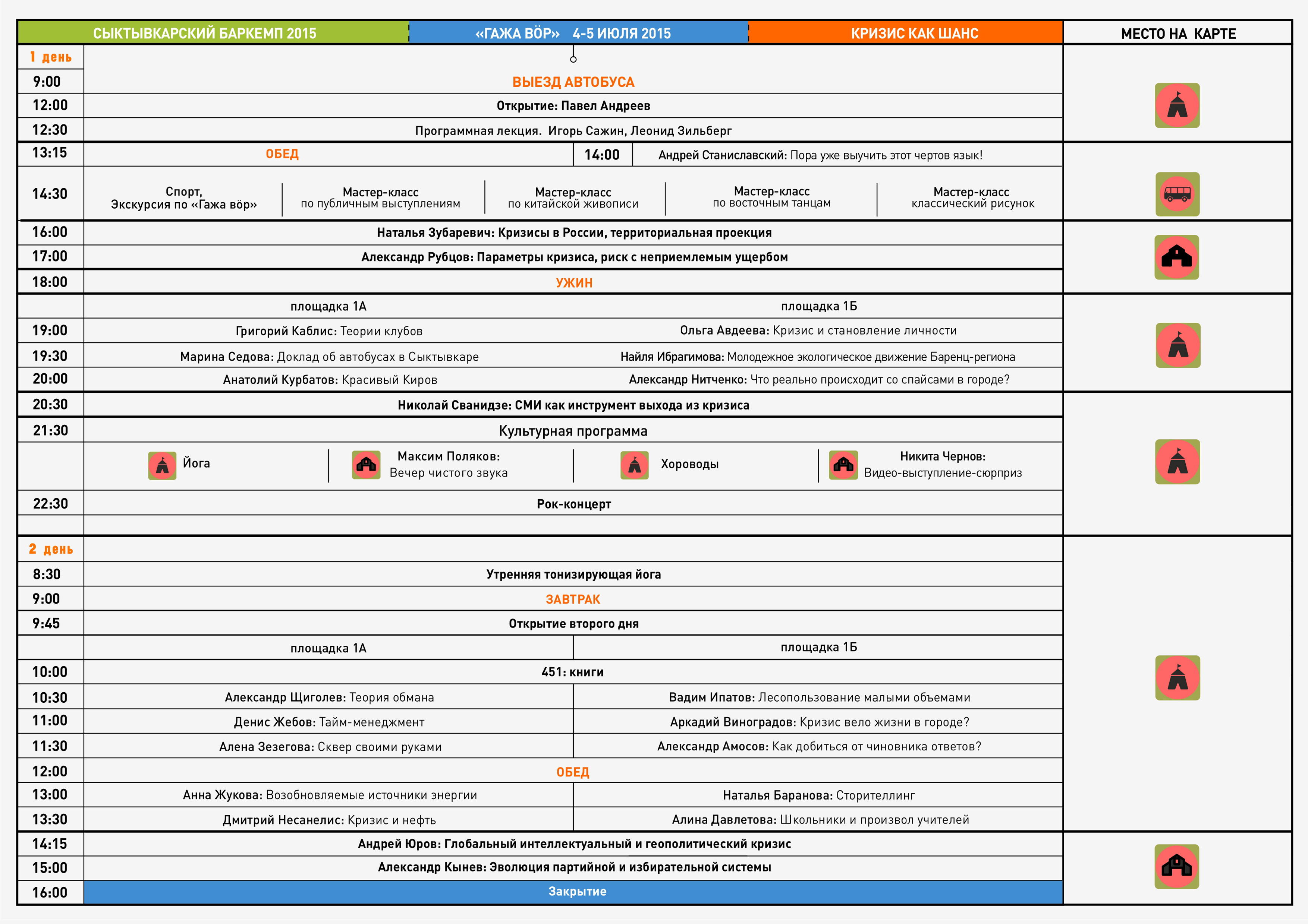 Today the names of all the speakers at the Syktyvkar BarCamp 2015, which will be held on July 4-5 at the tourist camp "Гажа Вöр", became known. The event organizers have published the program in the social network. There are 41 units: performances, workshops, sports and cultural events.