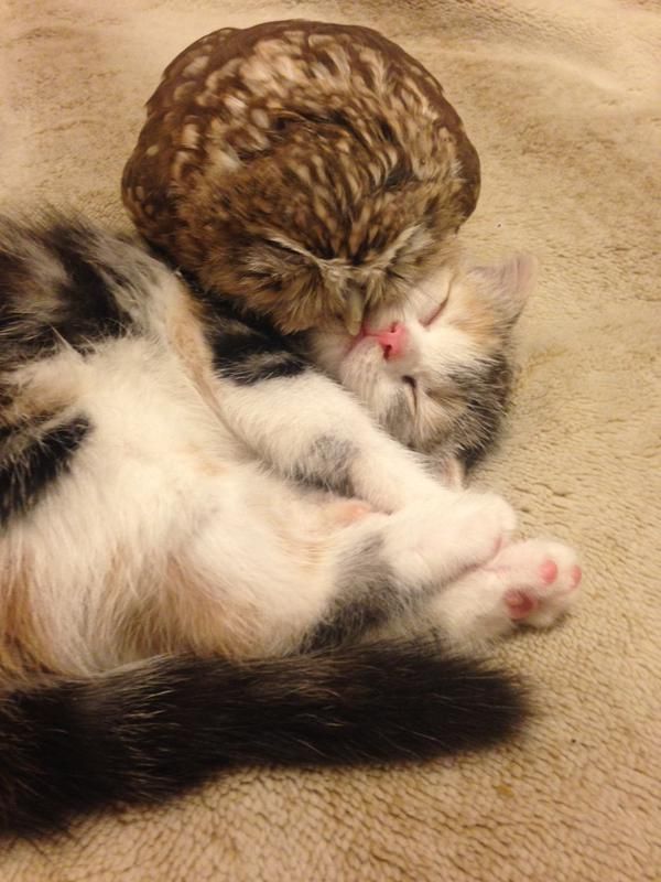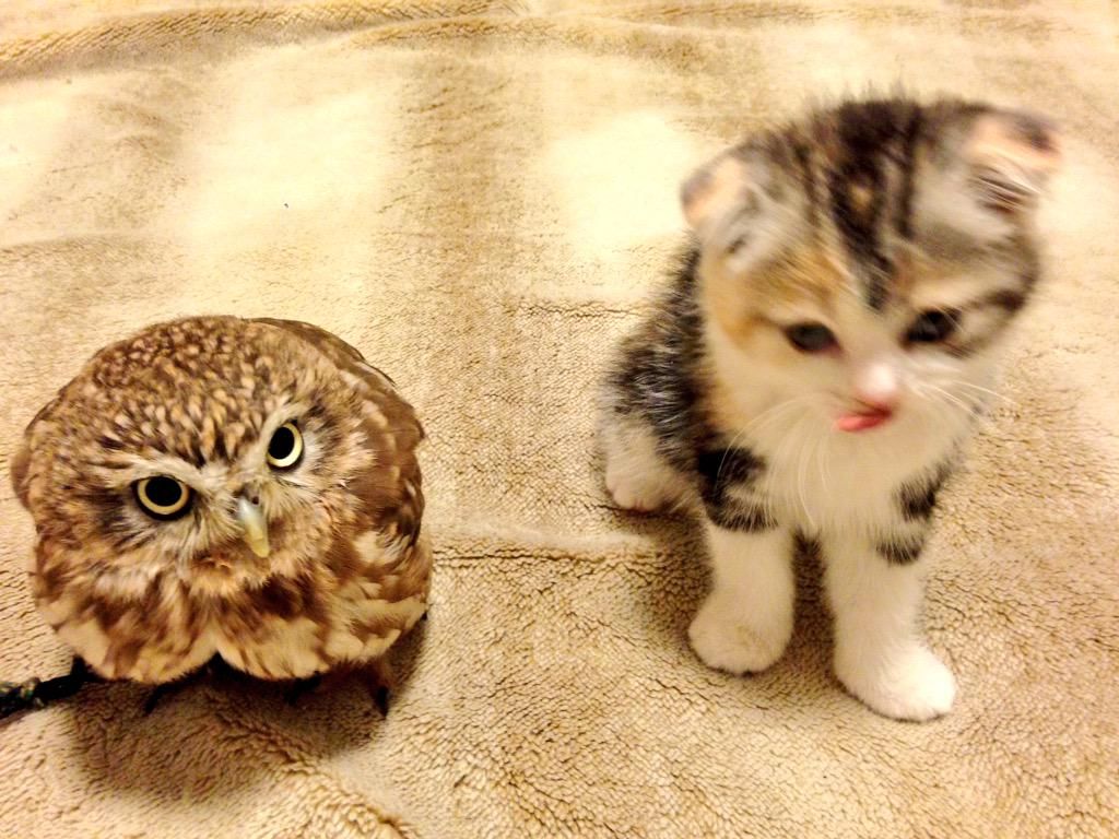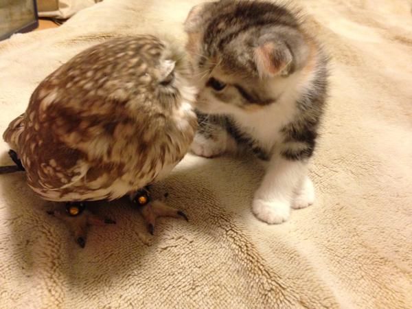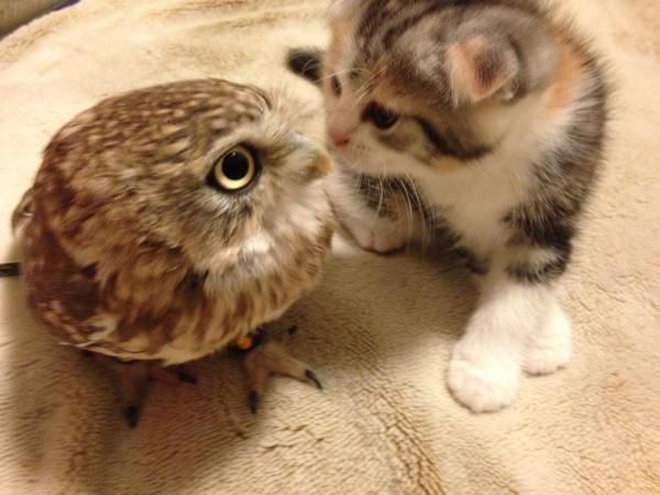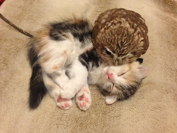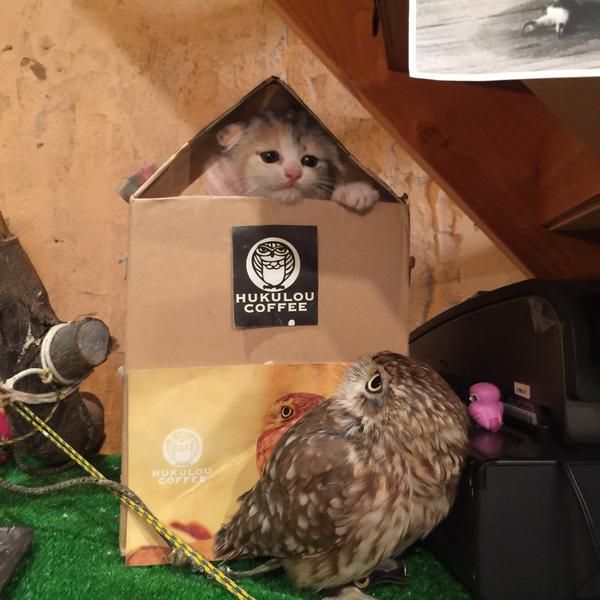 В кафе Hukulou в Осаке (Япония) завелась необычная пара друзей — котенок и сова. Котенка зовут Маримо, а сову Фуку. Они и играют, и спят вместе.