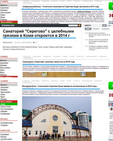 Стоит отметить, что кроме «Финно-угорского этнопарка» в республике существует еще ряд грандиозных проектов, которые в течение многих лет «открываются» и «выходят на самоокупаемость». К примеру, санаторий «Серегово», строительство которого длится более 20 лет, или аэропорт «Соколовка», заявления о восстановлении которого появляются ежегодно.