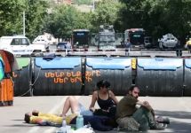 "Если до 21:00 следующего понедельника (20:00 мск) хоть одно из наших требований не будет выполнено, то мы начнем осуществление действий под названием "шаг вперед": каждый день мы на шаг будем приближать наши баррикады к резиденции президента", - заявил на митинге представитель демонстрантов Давид Санасарян. В качестве баррикады участники протестов используют пустые мусорные баки.