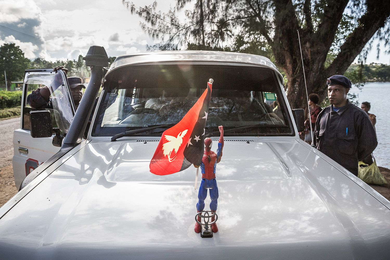 Полицейские из мобильного отряда Папуа — Новой Гвинеи стоят рядом со своим автомобилем, на капоте которого установлена фигура человека-паука с флагом Папуа — Новой Гвинеи. Нахождение мобильного отряда на территории Мануса спонсируется правительством Австралии. За время своего присутствия на Манусе, полицейские убили двух местных жителей. 21-летний Раймонд Сипаун был избит до смерти на местном рынке при свидетелях в июле 2013 года. 17-летний Кисавен Покас был убит в июне 2014 года по дороге из школы полицейским, предположительно пьяным.