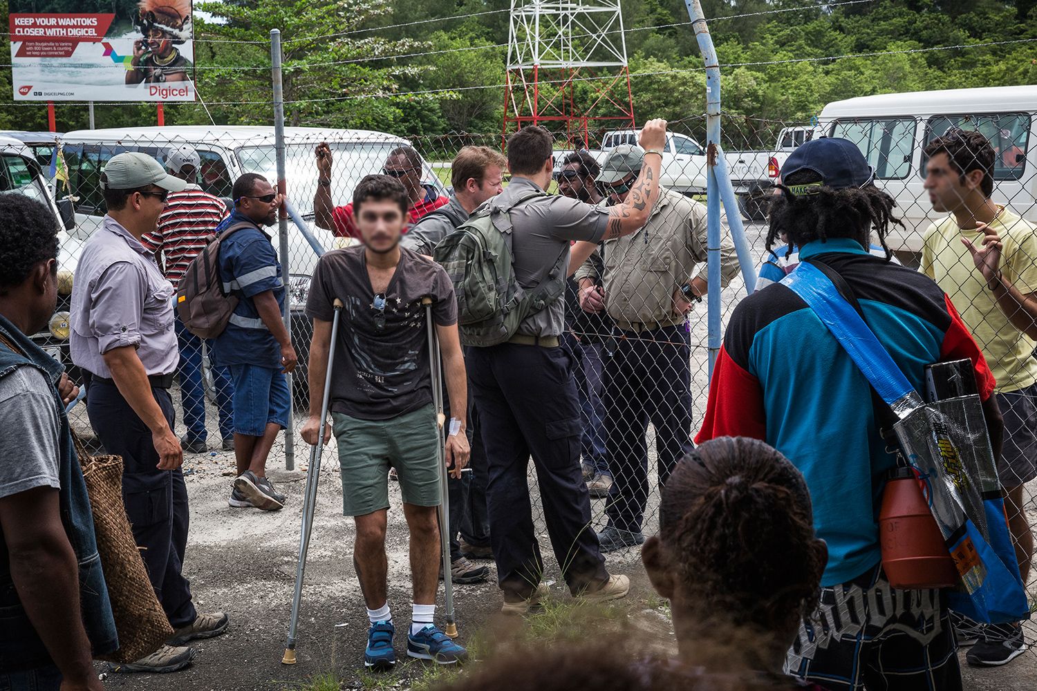 Травмированный беженец в аэропорту острова Манус, после лечения в госпитале Порт-Морсби, столицы Папуа — Новой Гвинеи. По различным свидетельствам, охранники центра неоднократно избивали беженцев и угрожали убить. В феврале 2014 года во время протеста беженцев против условий содержания в центре, охранники убили 23-летнего Резу Барати. Два человека были арестованы за это преступление, но суд над ними пока не закончился.
