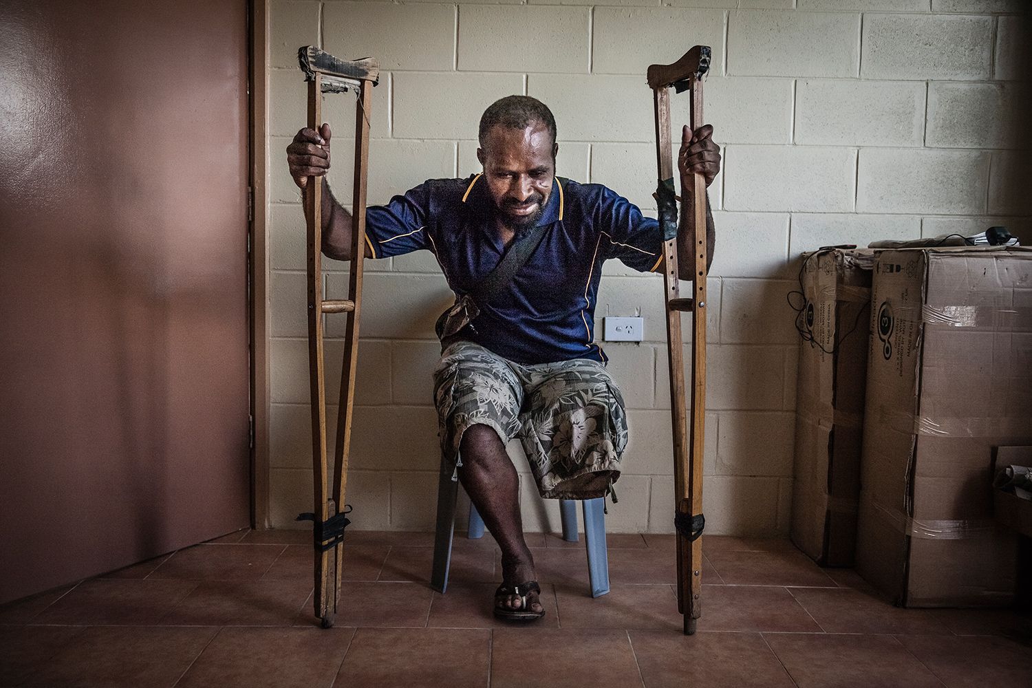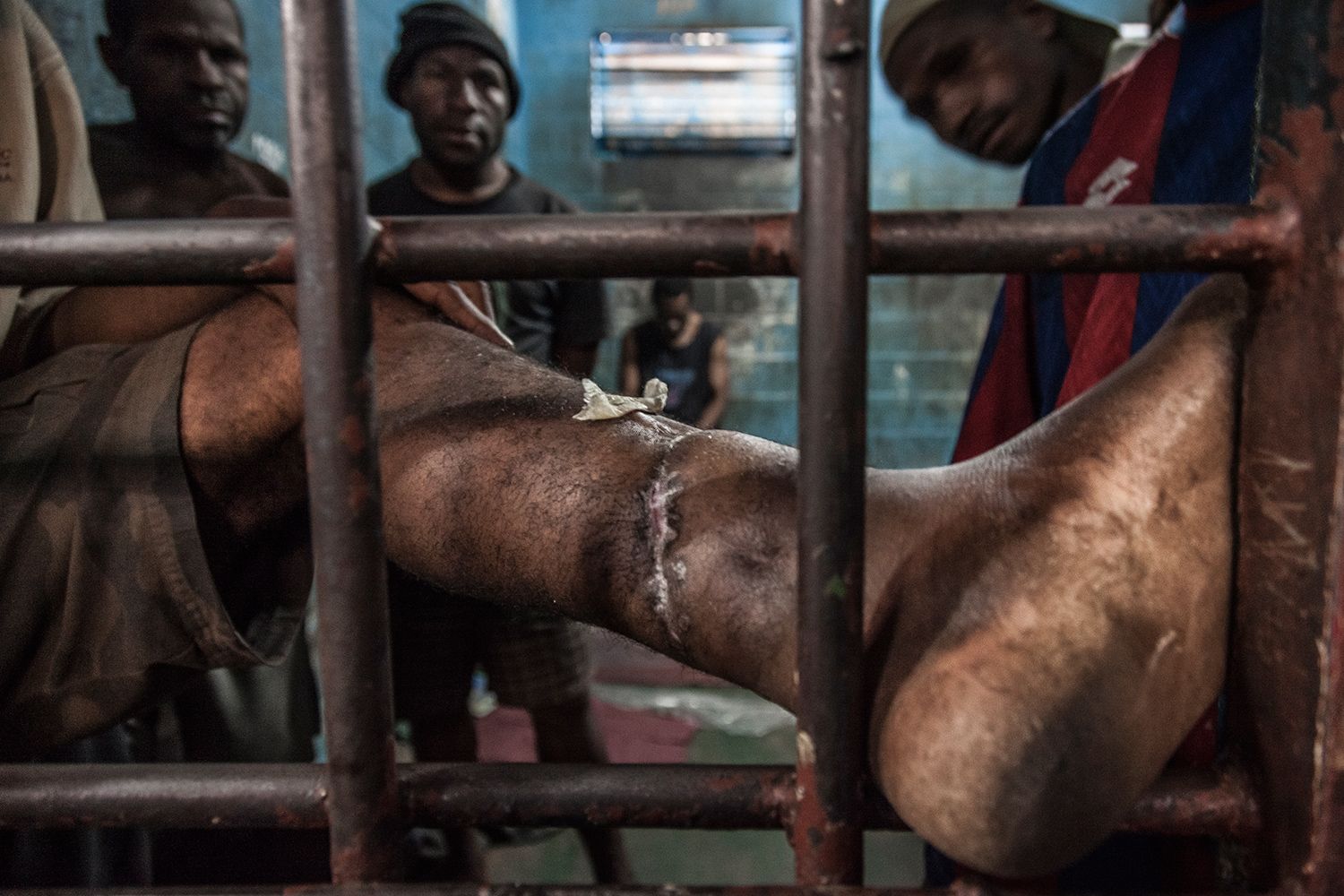 28-летний Ноел Монду, задержанный в полицейском участке города Кундиава, Папуа — Новая Гвинея, показывает ногу, которую местный полицейский пытался отрезать мачете, чтобы наказать Ноела за прогулки по городу в пьяном виде. Затем Ноел был оставлен на неизвестное время в тюремной камере, где сокамерники оказали ему медицинскую помощь.