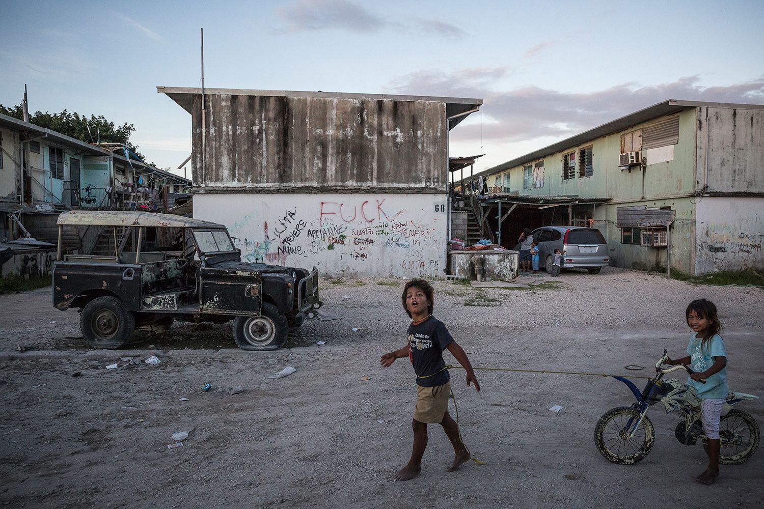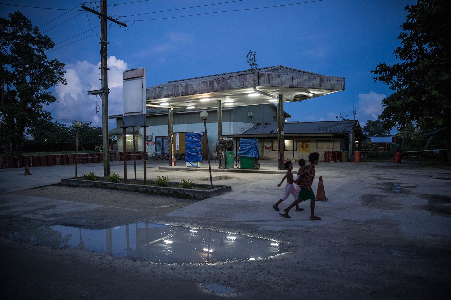 Дети гуляют по улице города Лоренгау на острове Манус. Несмотря на то, что Манус не является закрытой зоной Папуа — Новой Гвинеи и для его посещения не нужно особого разрешения, работники австралийских иммиграционных служб и частных охранных предприятий следят за представителями медиа, после того как они прибывают на остров. Так, автору этого репортажа после посещения острова Манус было отказано во въезде в Папуа — Новую Гвинею, где он до сих пор находится в списке персон нон-грата.