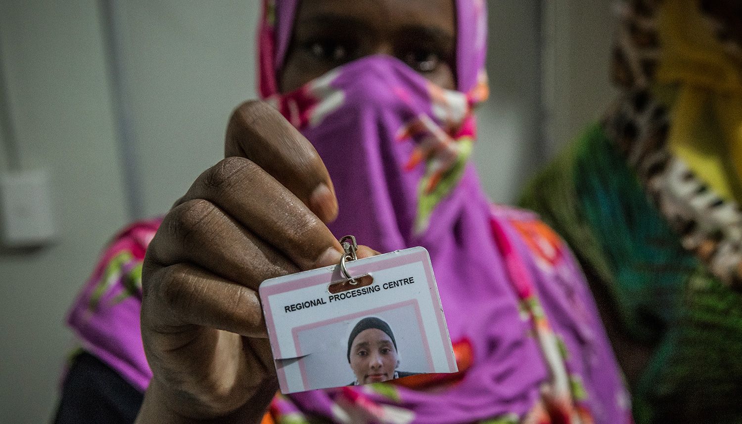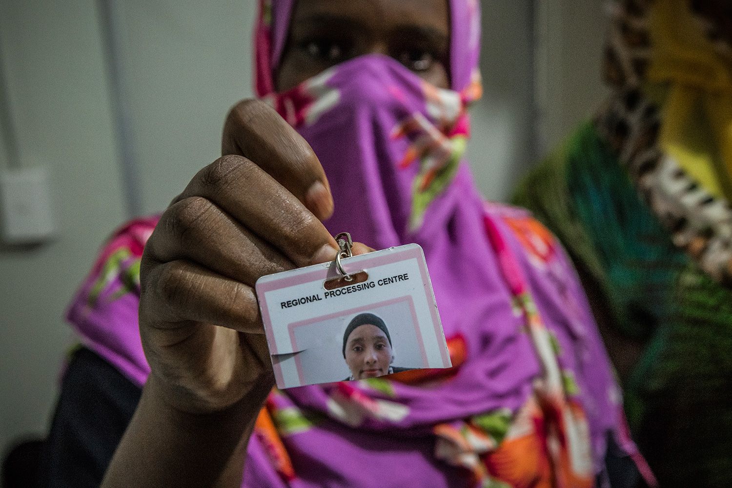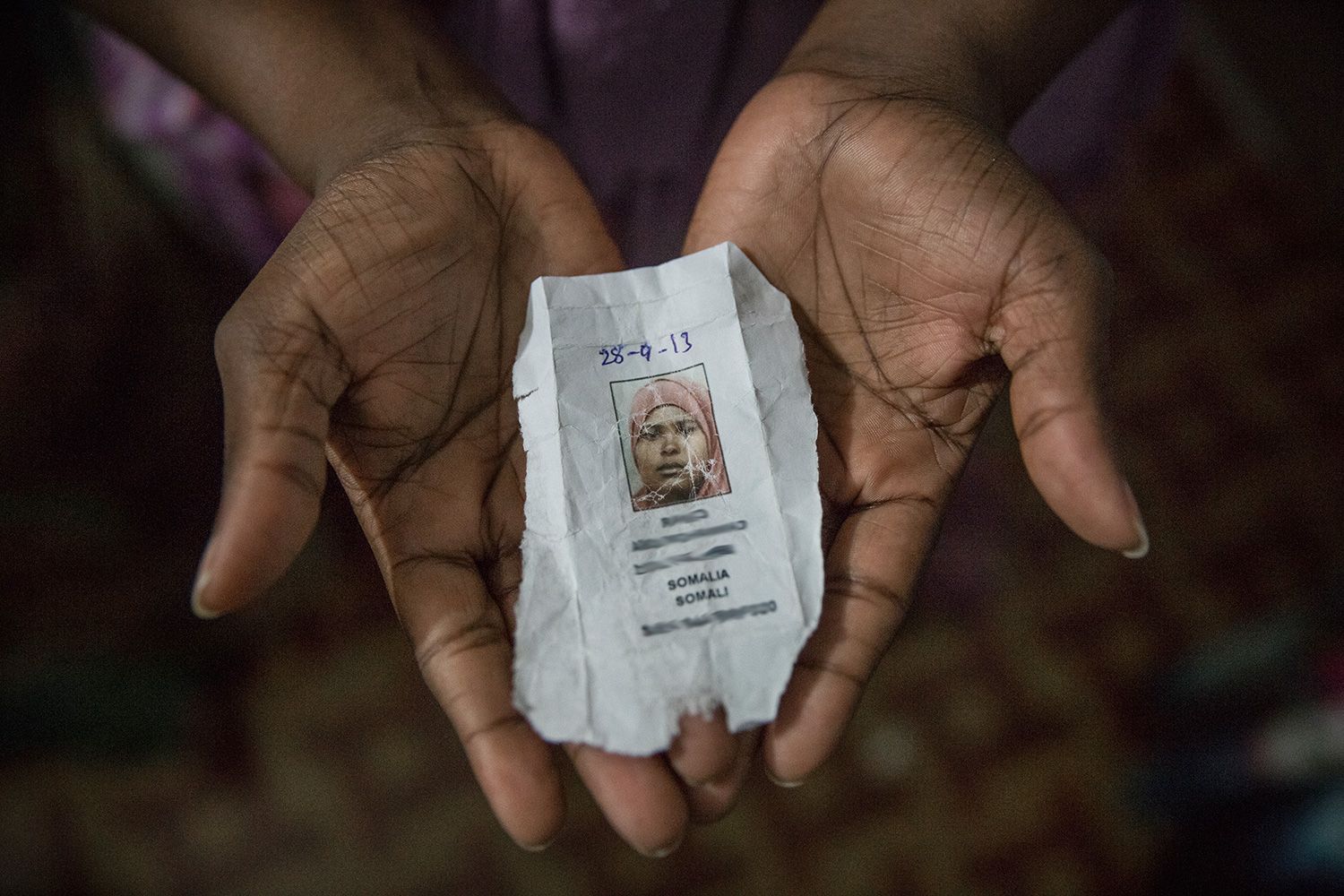 Женщина-беженец из Сомали показывает свою идентификационную карту, которую ей дали в австралийском центре содержания нелегальных иммигрантов. «Когда мне дали статус беженца и сказали, что я навсегда останусь в Науру, эту карточку у меня забрали и порезали. Я успела вытащить из мусорного бака часть, чтобы у меня осталось доказательство того, что меня держали в тюрьме почти год».