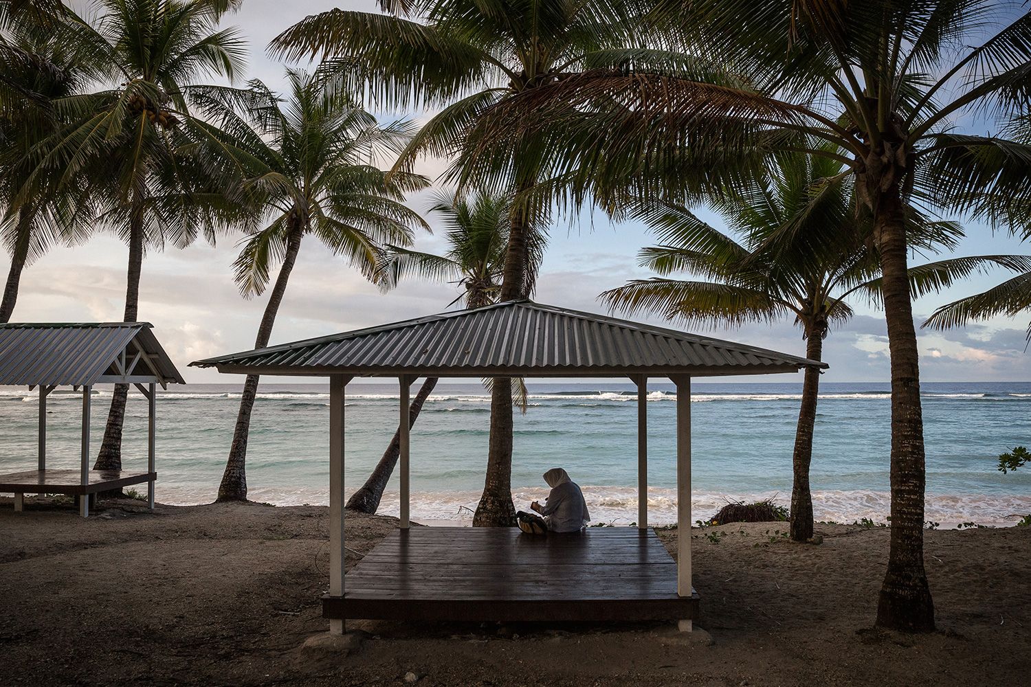 Фетемех, беженка из Ирана, ждет автобуса на одном из пляжей Науру. Тех людей, которые получили статус беженцев, австралийцы переселяют в лагеря, расположенные за территорией тюрьмы. От заключенных их отличает относительная свобода передвижения, но периодически на беженцев нападают местные жители. В Науру, где уровень безработицы достаточно высок, большинство местного населения не поддерживает решение правительства пустить на остров чужаков.