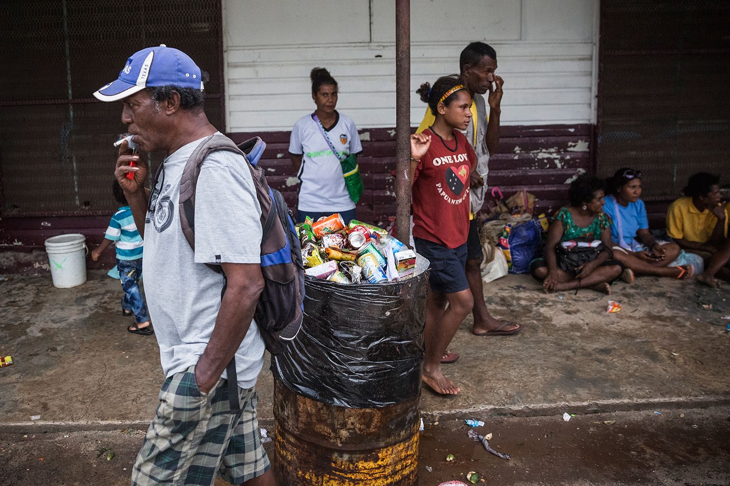 Люди на одной из улиц Лоренгау, столицы Мануса. После того, как на Манусе открылся лагерь для беженцев, Лоренгау стал притягивать к себе мигрантов со всей провинции, надеющихся получить работу в городе.
