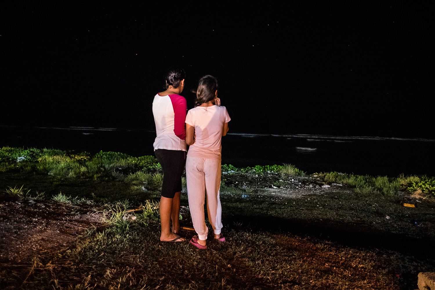 Две молодые девушки-беженки смотрят в сторону океана у входа в один из лагерей в Науру. Для многих Австралия до сих пор остается страной мечты. Беженцы в Науру и Манусе надеются, что австралийское правительство однажды изменит свое решение и разрешит им поселиться в стране, где они смогут чувствовать себя в безопасности.