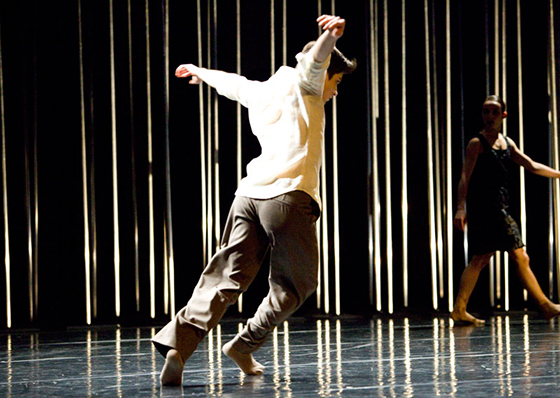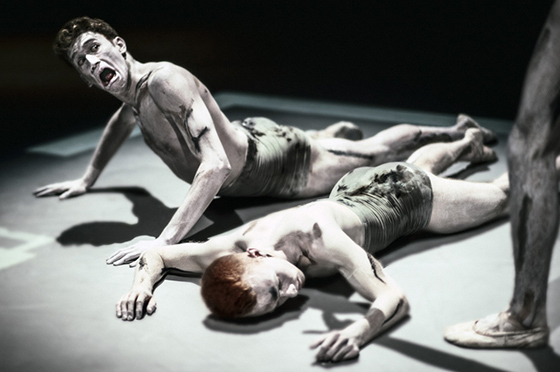Во-вторых, программу нынешних гастролей составили старые хиты — относительной новинкой можно было счесть разве что «I New Then» (2012), незатейливую вещицу для разогрева публики. Хореограф Йохан Ингер эффектно использовал простейшие приемы композиции: канон — синхрон — разрушение синхрона; вот все бегают по кругу, а вот резко распались на три группы, и каждая танцует свой текст. При этом лексику Ингера трудно назвать свежей: контракции и слайды «контемпа», па классического балета в мизерных дозах, расхлябанный бег, смешные рожицы и кукольные жесты. Все вместе — сущая танцевальная тарабарщина, секретный язык котенка по имени Гав. Лучше всего он работает в кульминации спектакля: пока «лирическая пара» медленно раздевается между сверкающих штырей, расставленных в дальнем углу, по пустой сцене бродит солист. Когда очередной предмет гардероба падает на пол, чудак-одиночка заходится в истерике: бормочет вслух околесицу, заворачивается в узел, складывает пальцы в пистолетик и расстреливает зал — ну точно «Гамлет» из недавней премьеры Большого театра, только Гамлет-комик, исполняющий веселые лацци с грустными глазами. В партере кто-то хихикал, но вообще публика принимала шутовские выходки настороженно.