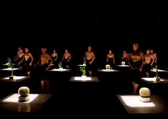 В «Cacti» кордебалет из шестнадцати человек, рассаженный на белые платформы, отбивает ладонями замысловатые ритмы и принимает позы йоги. Когда танцовщики расставляют белые квадраты по-шахматному и начинают танцевать, спектакль обретает симфоническое величие: так виртуозно выстраивать пластические контрапункты, так упиваться токкатным движением и так точно рассчитывать паузы в нем умеет только Экман. Беговую первую часть сменяет созерцательная вторая: пара солистов изображает репетицию дуэта, фонограмма проговаривает все происходящее вслух («Ты меня уронил? Вот с***!» — ироничный комментарий хореографа на тему собственного ремесла, позволяющий оценивать «Cacti» не как спектакль contemporary dance, но как традиционный неоклассический балет).