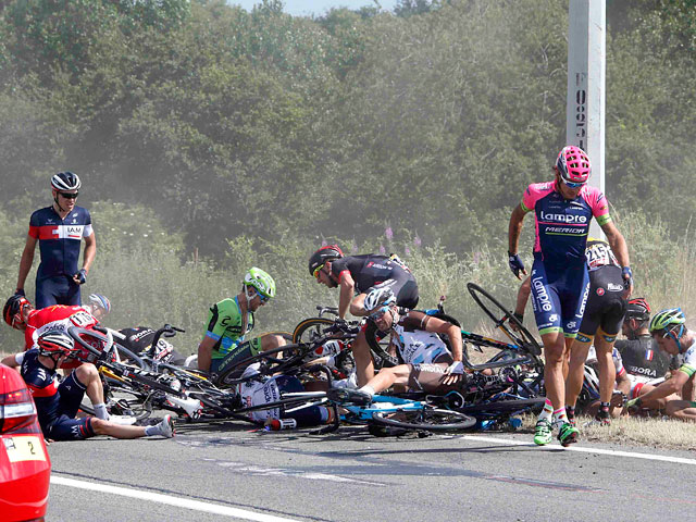 Крушение случилось на длинном прямом участке дороги, который пелотон преодолевал очень плотно, колеса велосипедов едва не касались друг друга. Падение одного из спортсменов вызвало цепную реакцию, и остальные начали валиться на обочину, словно кегли, отмечает Cyclingnews.com.