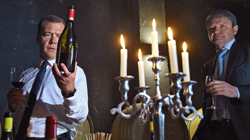 Бывший губернатор-тяжеловес Александр Ткачев — теперь министр сельского хозяйства — знакомит главу правительства с чудесами винного импортозамещения, Крым, 15 июня 2015 года
