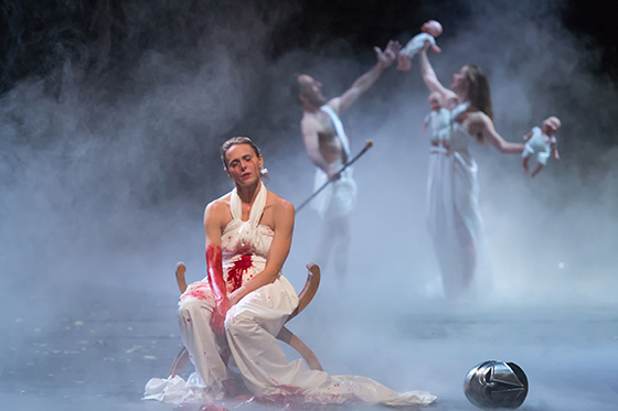 Но точно так же он смеется над феминизмом нашего времени. И вот на сцену выходит мужеподобная Клитемнестра, загримированная под Марию Каллас, божественный голос которой звучит в это время фонограммой. Клитемнестра рассказывает о том, как мужчины узурпировали права женщин, но когда она задирает подол платья, мы видим, что между ног у нее болтается уже не муляжный, а самый настоящий мужской член.