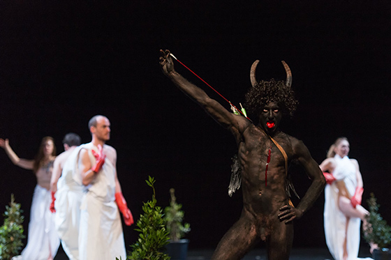 © Wonge Bergmann В «Горе Олимп» на место обывателей заступают мифологические персонажи. Но выясняется, что они ничем не лучше нас с вами. А если смотреть правде в глаза, так, пожалуй, и похуже. Все их великие установления, вся их доблесть, весь их героизм и вообще вся почитаемая ныне «классика» — это всего-навсего закрасивленная дикость. Собранные в одну длинную череду античные мифы вызывают не священный ужас, а банальную оторопь. Кровосмешения, дето- и матереубийства, расчлененки, гекатомбы, человеческие жертвоприношения, совершаемые героями при попустительстве, одобрении и прямом соучастии богов, — вот она, ваша прекрасная античность. Ахиллы, Аяксы, Одиссеи, живущие иллюзиями о славе и мужской доблести, так же похожи на героев, как на кровавых мясников. Куски мяса тут разбросаны повсюду. Артисты вытаскивают их из-за пазухи, бьют ими себя в грудь, складывают их на белую простыню, пропитывают кровью тоги и саваны. Оргия толерантности продолжается, только теперь она становится кровавой. Всех можно убить, со всем можно совокупиться. Даже с цветочными кустами. Артисты Фабра почти всегда обнажены и почти всегда готовы к сексуальным утехам. Даром, что ли, на его Олимпе всем заправляет глумливый Дионис.