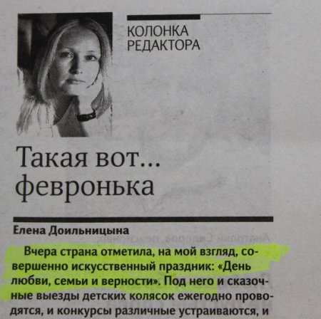 На этот раз главред «Архангельска» решила копнуть ещё глубже и раскритиковать саму идею праздника. Досталось трогательному и абсолютно аполитичному Дню любви, семьи и верности (в православной традиции Дню святых Петра и Февронии). Как (это лично я восклицаю), замужняя женщина Лена против верности в любви?! И сам себе отвечаю – она против всего того, что нравится мэра Архангельска Виктору Павленко, принимавшему активное участие в праздновании и сказавшего проникновенные слова о любви и верности, подчеркнув, что лично для него семья – традиционный союз мужчины и женщины, а не нетрадиционные изыски «секс-гурманов».