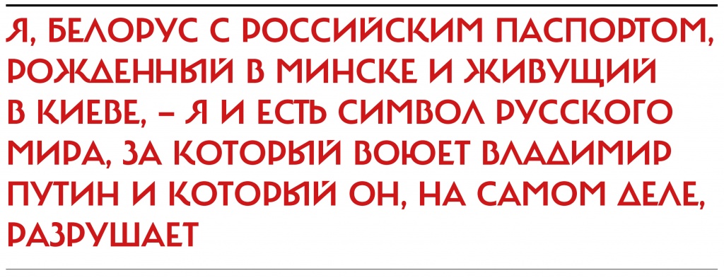 Я, белорус с российским паспортом, рожденный в Минске, с детьми, имеющими белорусское гражданство, но выросшими в Москве и считающими себя русскими, живущий в Киеве, и с близкими родственниками — украинцами, — я и есть символ Русского мира, за который воюет Владимир Путин и который он, на самом деле, разрушает. По крайней мере, мой Русский мир тоже рухнул: теперь в Москве я под подозрением «как агент киевской хунты», а в Киеве на меня косо смотрят как на «агента Кремля».