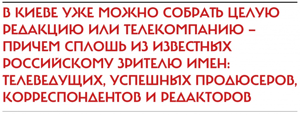 Если вечером в центре украинской столицы вы случайно столкнетесь с кем-то из московских коллег-журналистов, то не стоит удивляться, что он — ваш новый сосед по дому: в Киеве уже можно собрать целую редакцию или телекомпанию — причем сплошь из известных российскому зрителю имен: телеведущих, успешных продюсеров, корреспондентов и редакторов.