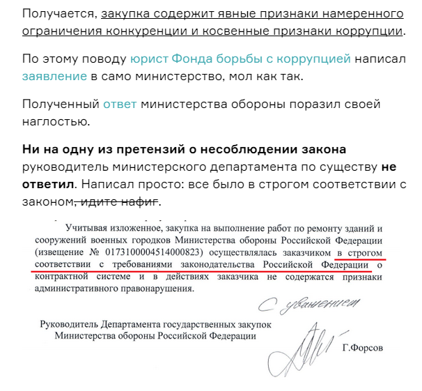 Юрист "Фонда борьбы с коррупцией" (ФБК) Любовь Соболь в июне опубликовала расследование о том, как Министерство обороны заключает госконтракты на ремонт военных зданий. В нем речь идет о контракте, не имеющем отношения к омской казарме, но ярко демонстрирующем, как происходят подобного рода госзакупки. Контракт был заключен в декабре 2014 года на 2015–2017 годы, а ремонт казармы проводился в 2013–2014 году. Организация "Главное управление обустройства войск" получила контракт на 27 миллиардов рублей без тендеров и конкурсов – распоряжением Дмитрия Медведева. ФБК добился того, что Антимонопольная служба признала такую госзакупку незаконной, и по закону теперь чиновники должны понести ответственность, а контракт должен быть расторгнут. Любовь Соболь не исключает, что ремонт омской казармы проводился в таких же условиях – в результате коррупционной сделки с Минобороны, выполнение которой невозможно проследить и проконтролировать, потому что большая часть информации по таким госзакупках засекречена, что тоже противоречит законам: