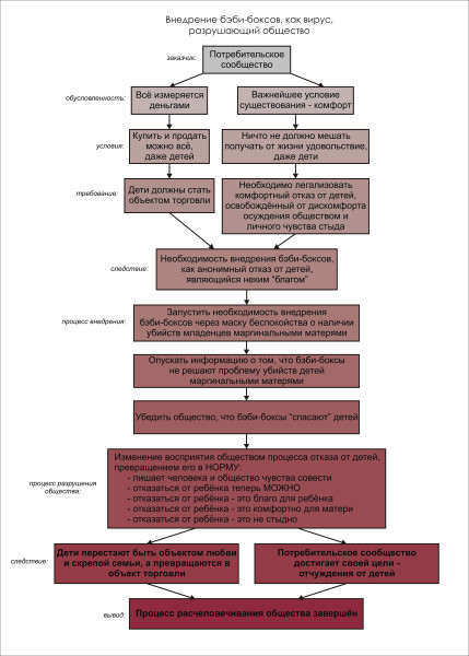 Есть ещё один момент, который также приоткрывает манипуляцию застрельщиков детоприёмников, который можно выявить из их выступлений на прошедшем «круглом столе». В последней схеме эта позиция названа: «Запустить необходимость внедрения бэби-боксов через маску беспокойства о наличии убийств младенцев маргинальными матерями».