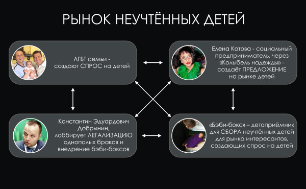То есть мы видим в этой схеме подтверждение, выявленное выше, наличия рынка детей, спроса и предложения на них, а также участие в этом бэби-боксов. Здесь дети становятся объектом торговли, а процесс отказа от детей через анонимность освобождается от дискомфорта осуждения обществом и личного чувства стыда, что стимулирует общество на лёгкий отказ от детей.