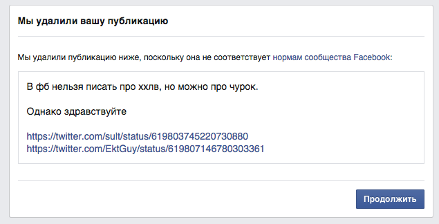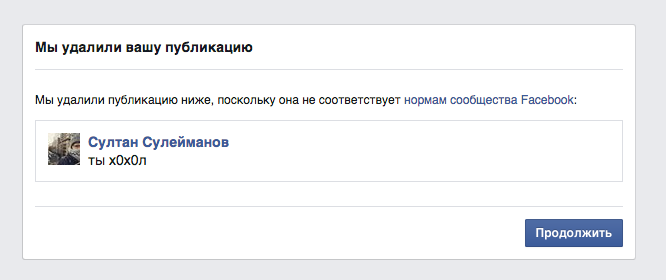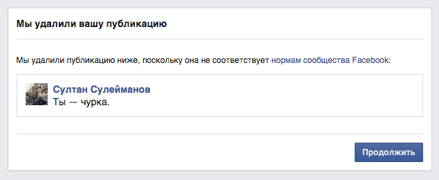 13 июля, то есть спустя два дня после первого ответа об отсутствии нарушений, Facebook все же догадался, что слово «чурка» — оскорбительное. Вышло так, что модераторы заблокировали меня за пост о том, что они не считают слово «чурка» нарушением, поскольку позднее они решили, что оно все же нарушает правила.