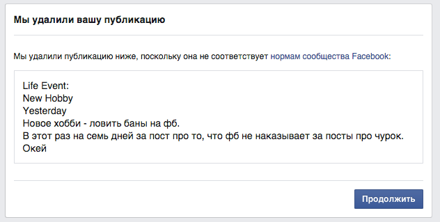 Такой ответ пришел сразу нескольким пользователям, пожаловавшимся на исходный пост. Решив, что на этом издевательский эксперимент над Facebook закончен, я написал короткий пост… И получил за него новую — теперь уже недельную блокировку.