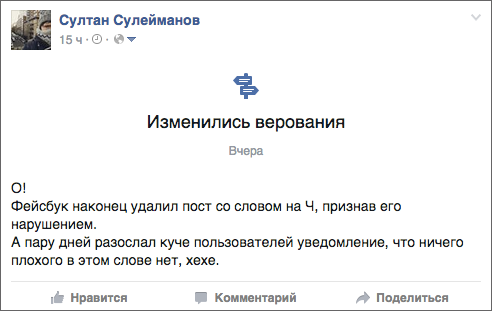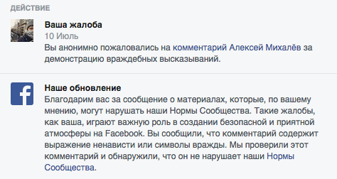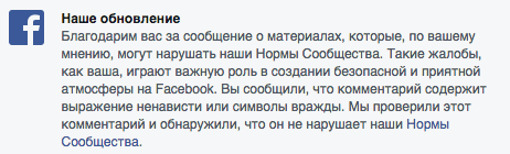Затем я решил проверить, насколько модераторы Facebook разбираются в оскорблениях на национальной почве, принятых в русском языке. Написал пост «Ты — чурка», попросил читателей пожаловаться и начал готовиться к очередной блокировке.