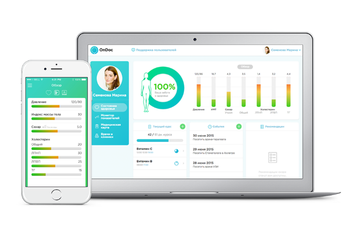 Интерфейс кросс-платформенной медицинской карты ONDOC Это первый в России интерактивный сервис для работы с медицинскими данными. Им можно пользоваться как электронной медицинской картой, в которую вносится информация об операциях, аллергии на лекарства и перенесенных заболеваниях. Медицинская карта заполняется вручную или автоматически. В подключенных клиниках врачи вместо того, чтобы выписывать рецепты и направления, отправляют все данные о приеме в личный профиль пользователя. Проект уже работает в Петербурге со стоматологической клиникой «Аллегро». Клиника СМТ только начала сотрудничество, и сейчас тестирует передачу данных. Если пользователь не посещает партнерские клиники, заполнить электронную медкарту можно самостоятельно. Добавить записи из бумажных медицинских документов можно двумя способами: ввести все данные вручную или отправить фото документов на оцифровку. Приложение синхронизируется с AppleHealth и отображает данные, полученные при помощи фитнес-трекеров и «умных» устройств для контроля за медицинскими показателями. В ONDOC можно настроить push, email или SMS-уведомления, которые будут напоминать о визите к врачу или приеме лекарств.